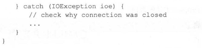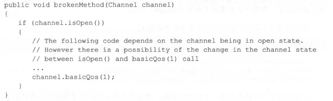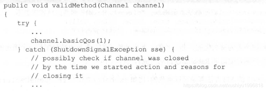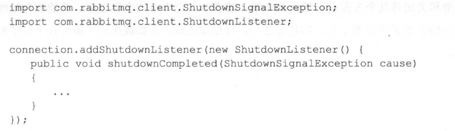 通常情况下,在调用createXXX或者newXXX方法之后,我们可以简单地认为 Connection或者Channel已经成功地处于开启状态,而并不会在代码中使用isOpen这个 检测方法。如果在使用Channel的时候其已经处于关闭状态,那么程序会抛出一个 com.rabbitmq.client.ShutdownSignalException, 我们只需捕获这个异常即可。当 然同时也要试着捕获IOException或者SocketException, 以防Connection意外关闭。 示例代码如代码消单所示。