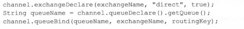 上面创建了一个持久化的、非自动删除的、绑定类型为direct的交换器,同时也创建了一 个非持久化的、排他的、自动删除的队列(此队列的名称由RabbitMQ自动生成)。这里的交换 器和队列也都没有设置特殊的参数。