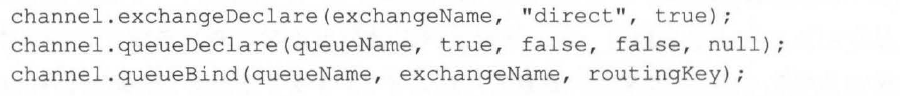 上面的代码也展示了如何使用路由键将队列和交换器绑定起来。上面声明的队列具备如下 特性:只对当前应用中同一个Connection层面可用,同一个Connection的不同Channel 可共用,并且也会在应用连接断开时自动删除。