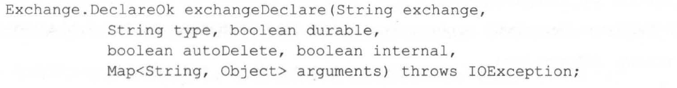 (3) Exchange.DeclareOk exchangeDeclare(String exchange, String type, boolean durable, boolean autoDelete, Map<String, Object> arguments) throws IOException;