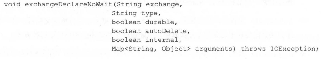 这个exchangeDeclareNoWait比exchangel)eclare多设置了一个nowait参数,这个nowait参数指的是AMQP中:Exchange.Declare命令的参数,意思是不需要服务器返 回,注意这个方法的返回值是VOID,而普通的exchangeDeclare方法的返回值是 :Exchange. DeclareOk, 意思是在客户端声明了一个交换器之后,需要等待服务器的返回(服 务器会返回:Exchange.Declare-Ok这个AMQP命令)。