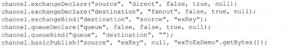 方法中的参数可以参考的exchangeDeclare方法。绑定之后,消息从source交 换器转发到destination交换器,某种程度上来说destination交换器可以看作一个队列。示例代 码如代码清单所示。