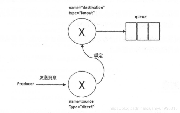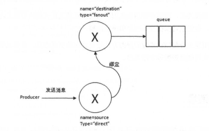 生产者发送消息至交换器source中,交换器source根据路由键找到与其匹配的另一个交换 器destination, 并把消息转发到destination中,进而存储在destination绑定的队列queue中,可 参考图