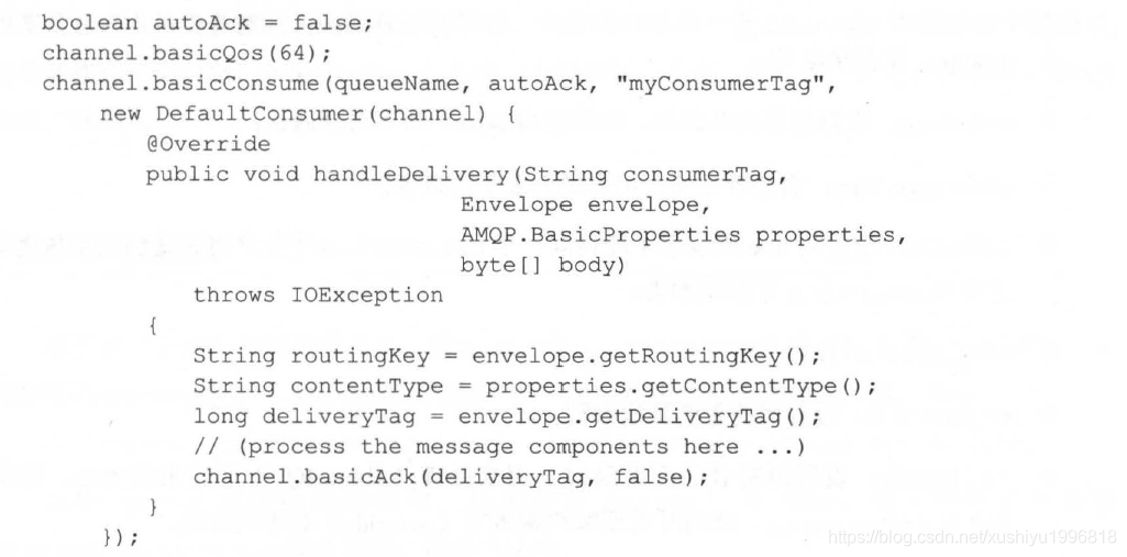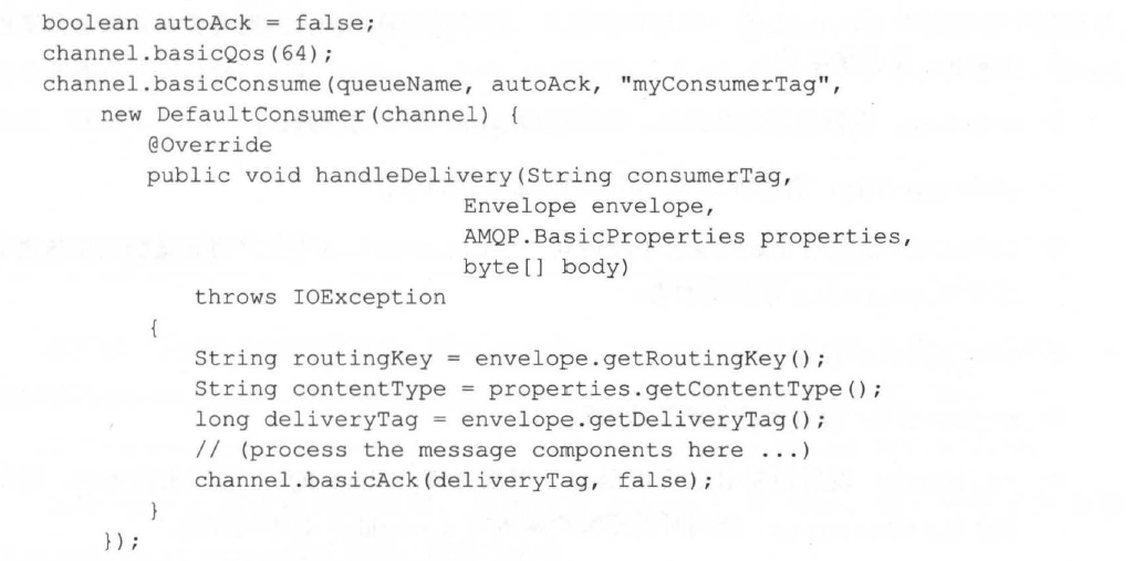 注意,上面代码中显式地设置autoAck为false, 然后在接收到消息之后进行显式ack操作(channel .basicAck), 对于消费者来说这个设置是非常必要的,可以防止消息不必要地 丢失。