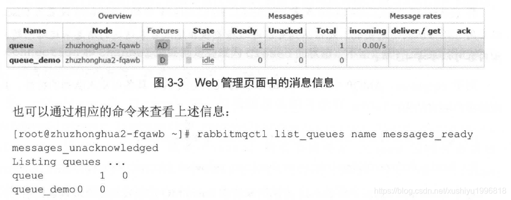 RabbtiMQ的Web管理平台上可以看到当前队列中的"Ready"状态 和"Unacknowledged"状态的消息数,分别对应上文中的等待投递给消费者的消息数和已经投 递给消费者但是未收到确认信号的消息数,参考图。