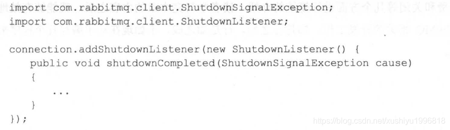 在Connection和Channel中,与关闭相关的方法有addShutdownListener (ShutdownListener listener)和remove ShutdownListener (ShutdownListner tistener)。当Connection或者Channel的状态转变为Closed的时候会调用 ShutdownListener。而且如果将一个ShutdownListener注册到一个已经处于Closed 状态的对象(这里特指Connection和Channel对象)时,会立刻调用ShutdownListener.getCloseReason方法可以让你知道对象关闭的原因;