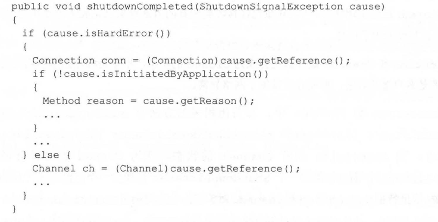 ShutdownSignalException提供了多个方法来分析关闭的原因。isHardError方法 可以知道是Connection的还是Channel的错误; getReason方法可以获取cause相关的 信息,相关示例可以参考代码清单。