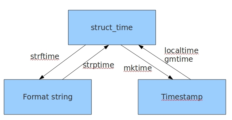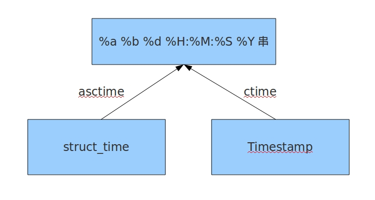 时间戳和结构化时间转换 t = time.time() time.localtime(t) print(time.gmtime(t)) t1 = time.localtime() print(time.mktime(t1))