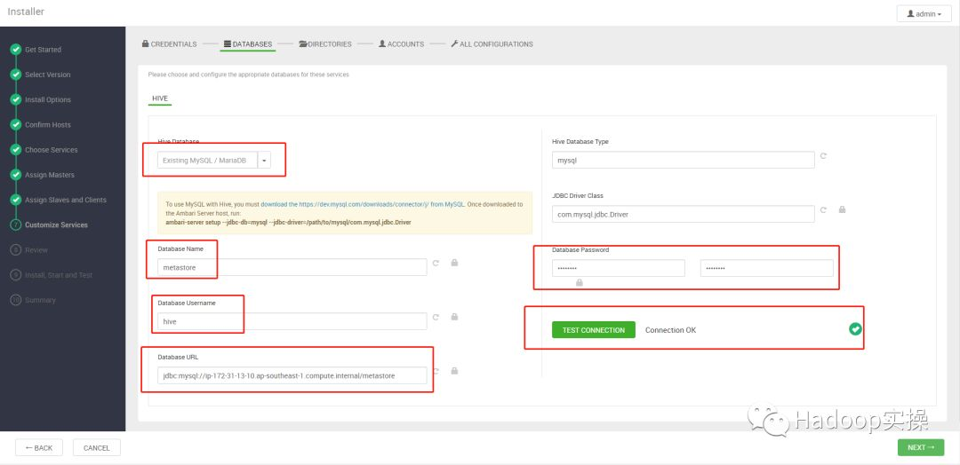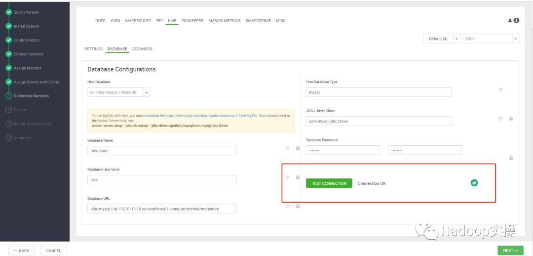 14.所有服务相关配置,保持默认,点击NEXT,注意需要单独点击到Hive的DATABASE页面再次测试一下数据库连接,否则会报警告。