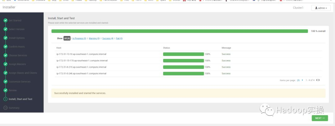 16.等待安装完毕,如果集群缺少libtirpc的包,会安装失败,可以参考最后面的“常见问题”,点击NEXT