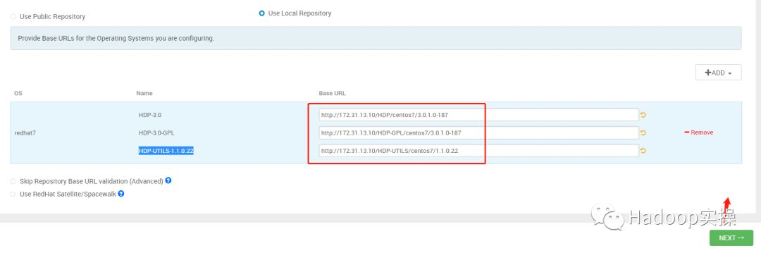 输入HDP-3.0,HDP-3.0-GPL,HDP-UTILS-1.1.0.22的http地址,点击Next