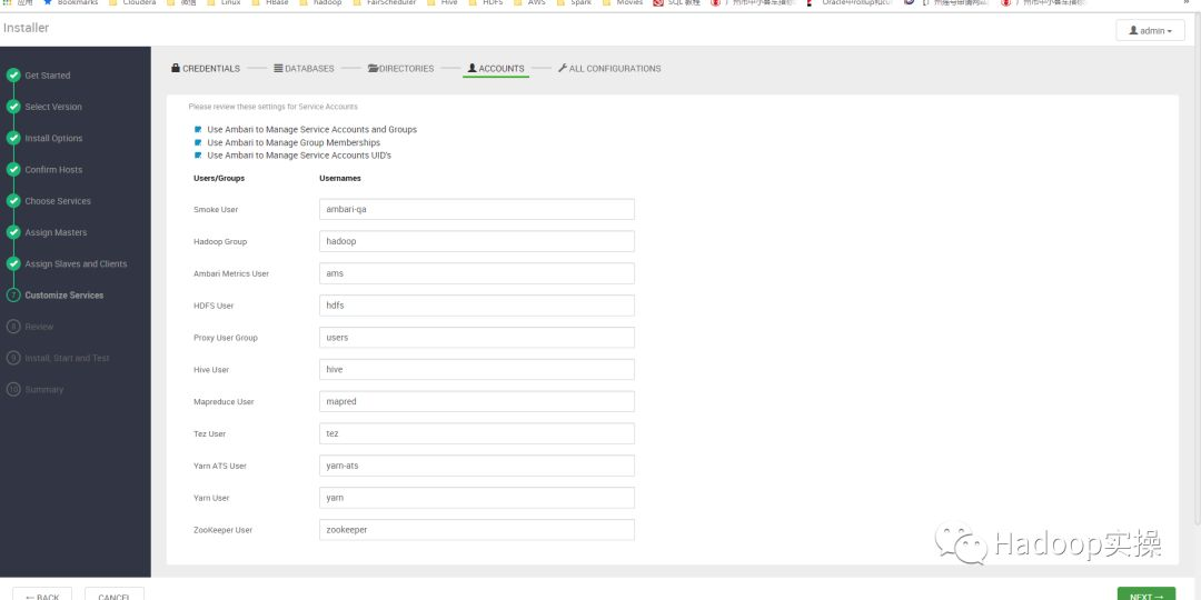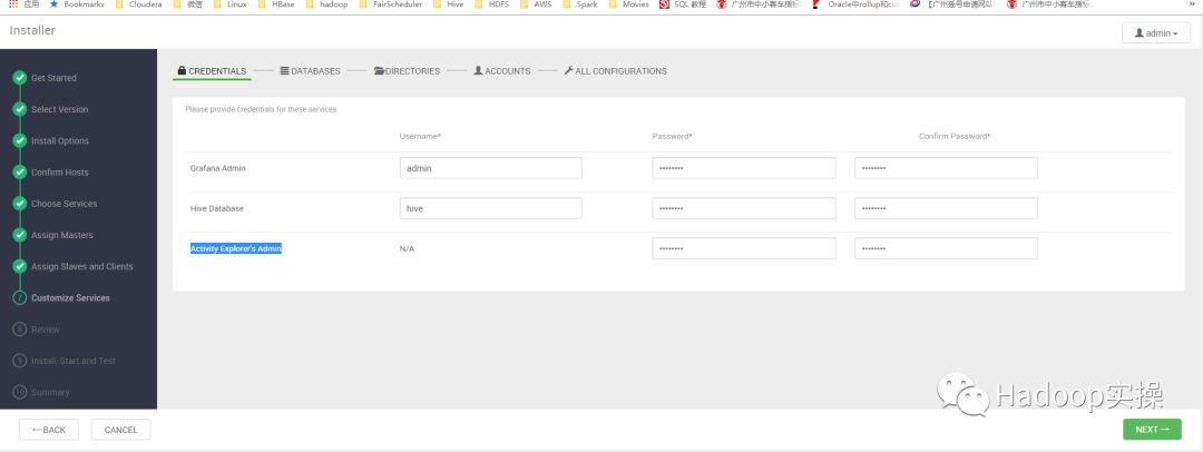 10.输入Hive数据库的用户名和密码,包括设置Grafana和Activity Explorer’s Admin的密码,点击NEXT