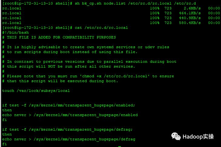 [root@ ip-172-31-13-10 shell]# sh ssh_do_all.sh node.list "echo never > /sys/kernel/mm/transparent_hugepage/defrag "