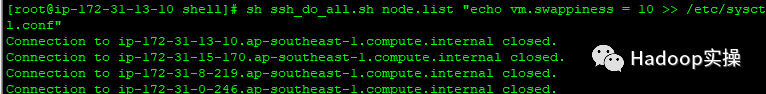 [root@ ip-172-31-13-10 shell]# sh ssh_do_all.sh node.list "echo vm.swappiness = 10 >> /etc/sysctl.conf"