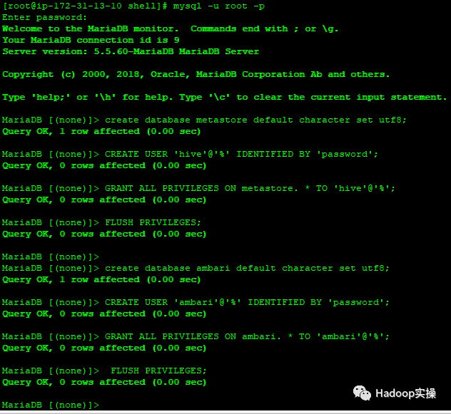 在Ambari也即是MySQL节点执行以下命令