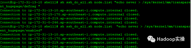 [root@ ip-172-31-13-10 shell]# sh ssh_do_all.sh node.list "echo never > /sys/kernel/mm/transparent_hugepage/enabled"