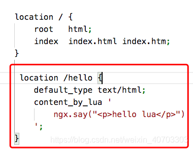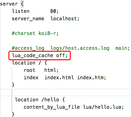 在上面的脚本中,修改了内容,则再次访问时还是原来的结果,这是因为其中有缓存,因此我们要将lua_code_cache关闭(注意生产环境不能关闭,因为会影响性能,开发环境可以关闭进行调试)