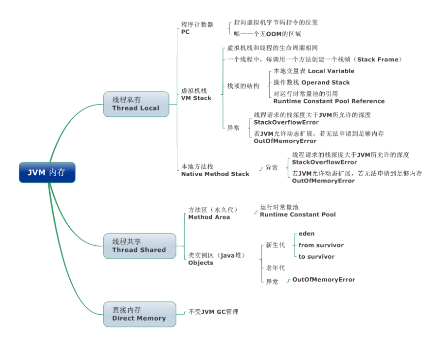 JVM 内存区域主要分为线程私有区域【程序计数器、虚拟机栈、本地方法区】、线程共享区域【JAVA 堆、方法区】、直接内存。