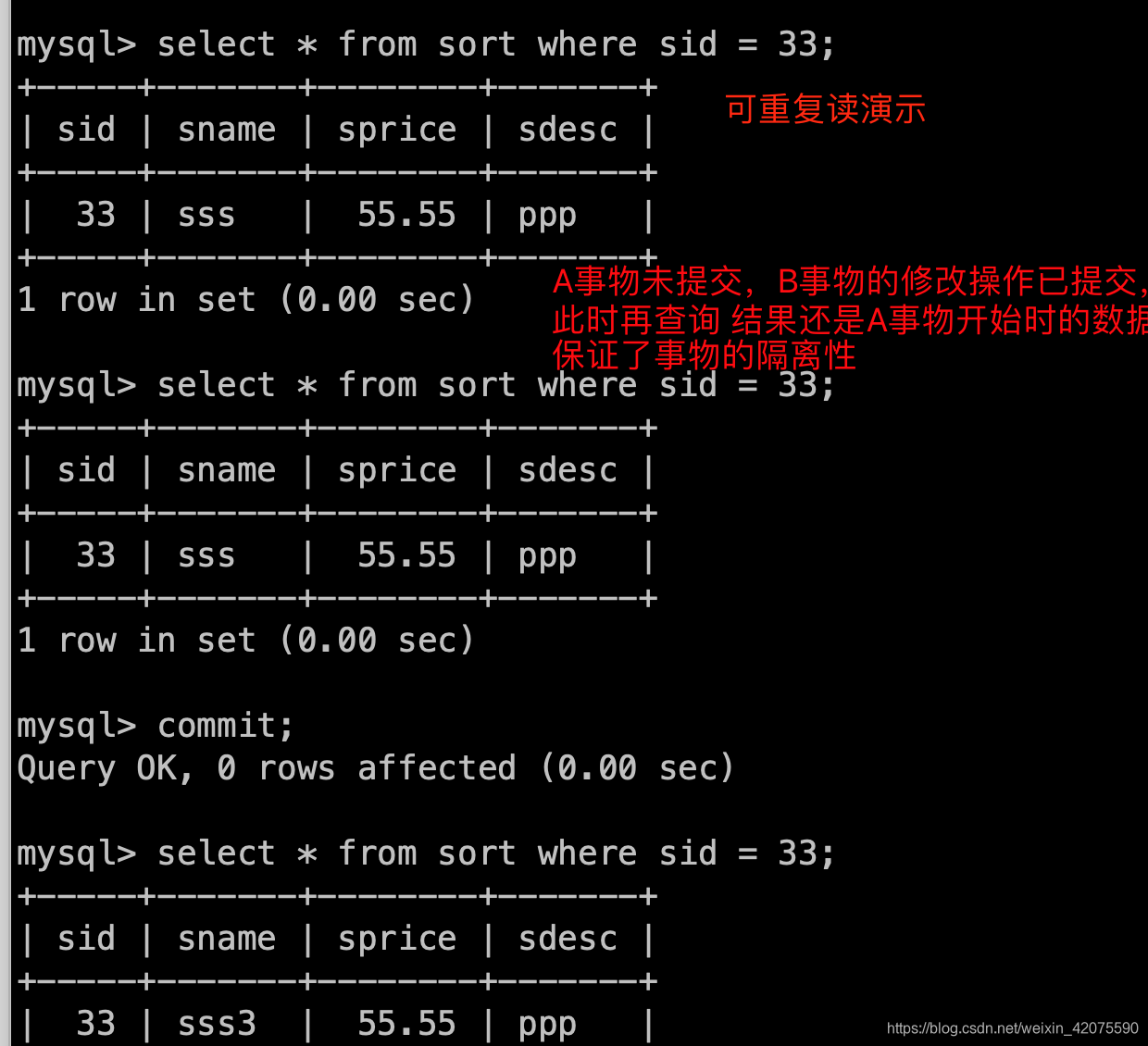 不可重复读 就是一个事务读到另一个事务修改后并提交的数据(update)。在同一个事务中,对于同一组数据读取到的结果不一致。比如,事务B 在 事务A 提交前读到的结果,和在 事务A 提交后读到的结果可能不同。不可重复读出现的原因就是由于事务并发修改记录而导致的。