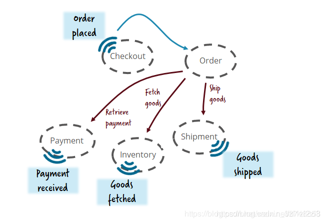 “Inventory”服务收到消息,从仓库里取货,并发送“Goods fetched”消息。“Shipment”服务得到消息,发送货物,并发送“Goods shipped”消息。