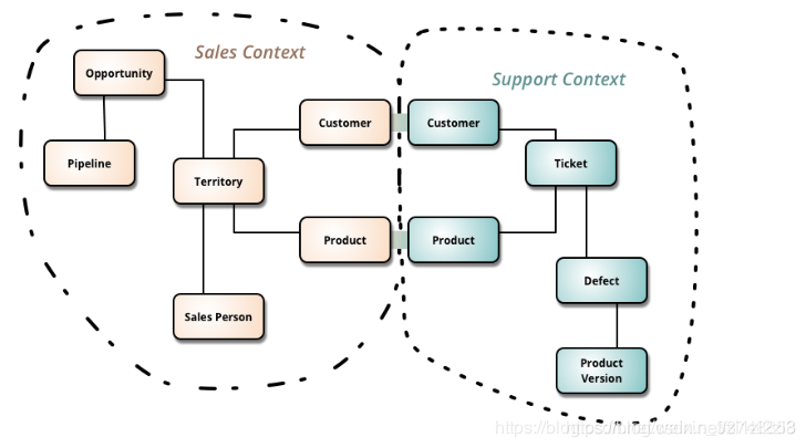 DDD中有一个很重要的概念,有界上下文(Bounded Context),可以用有界上下文来划分微服务,每个有界上下文都可以是一个微服务。下面是有界上下文的示例。下图中有两个服务“Sales”和“Support”。