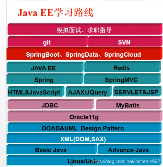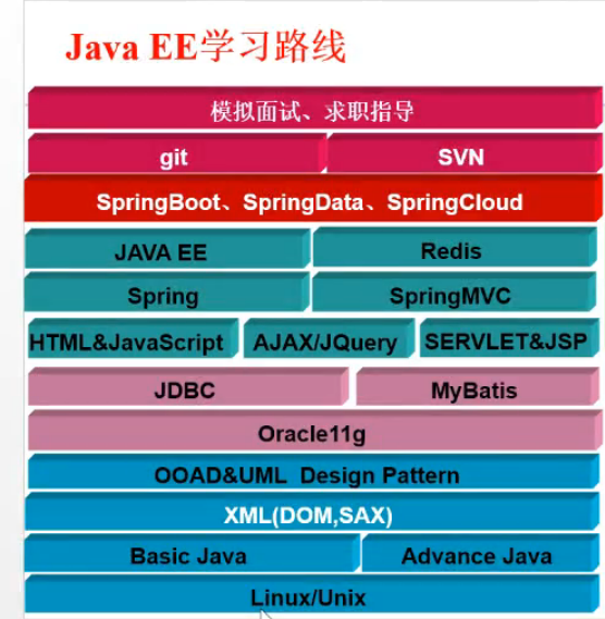 XML: 1、两个系统进行对接(如java与c++),可以通过XML。它是数据的载体,数据通过XML进行传输 2、系统的配置信息 OOAD:面向对象设计分析 UML:统一建模语言 用图形来描述信息(用例图、时序图、类图) Oracle数据库(还要MySql...) JDBC:java代码里面用程序进行操作数据库(比较底层的代码实现) MyBatis框架:对数据库进行封装 JAVA EE:核心是JSP、SERVLET Spring框架:JAVA EE体系最重要的框架 Redis:数据库的读写,属于一种内存数据库(内存读速度快) SpringMVC:后台代码的交互形式 M:模型 V:视图 C:控制 SpringBoot:神级框架 1、不需要进行手动配置,帮我们自动配置 2、帮我们对其他框架进行配置(MyBatis),相当于有一个项目管家 SpringData:实现数据操作 SpringCloud:实现微服务功能 git/SVN:版本控制工具,团队分工 项目实战: 物联网环境监测数据中心项目 电子商务网站 看点咨询后台管理 客户关系管理系统