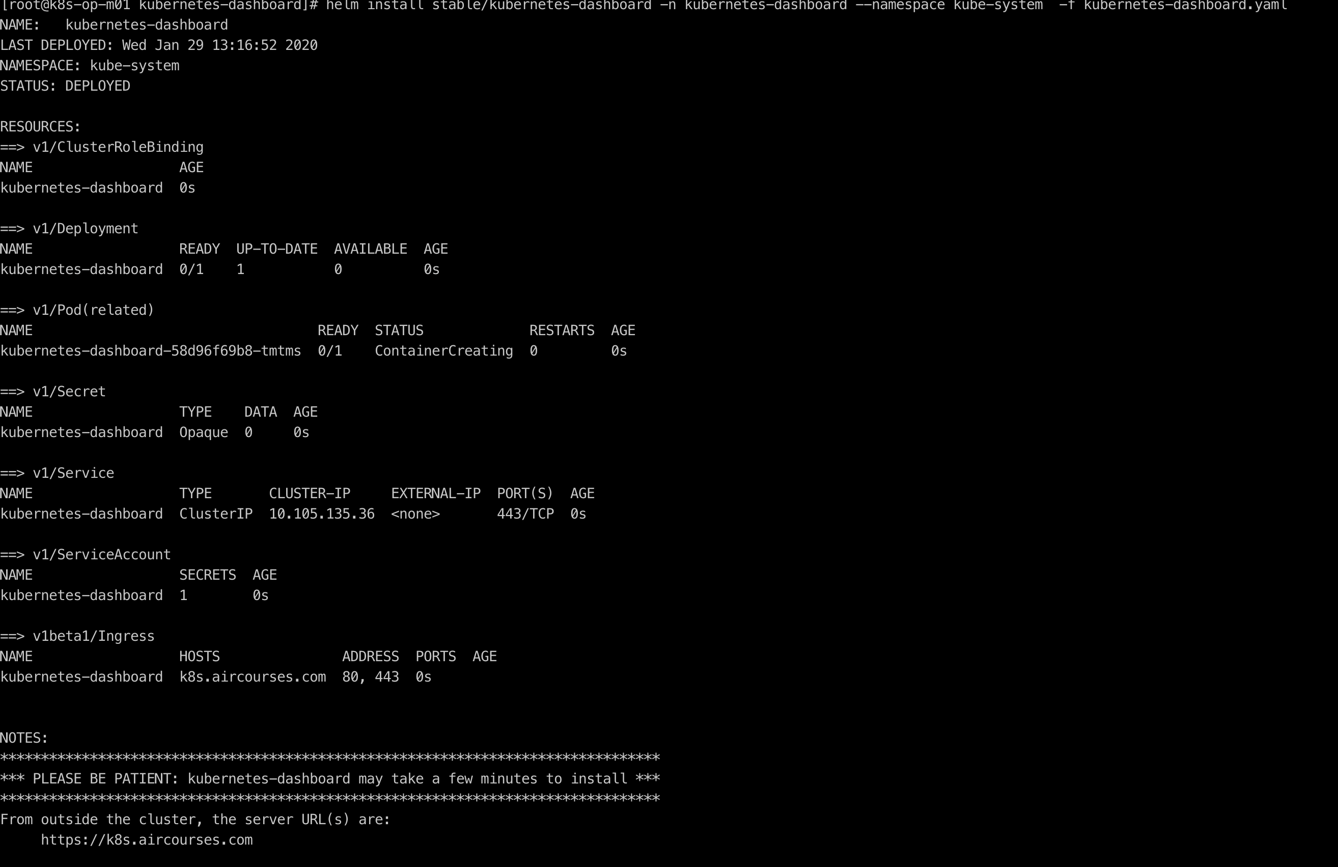 helm install stable/kubernetes-dashboard -n kubernetes-dashboard --namespace kube-system -f kubernetes-dashboard.yaml