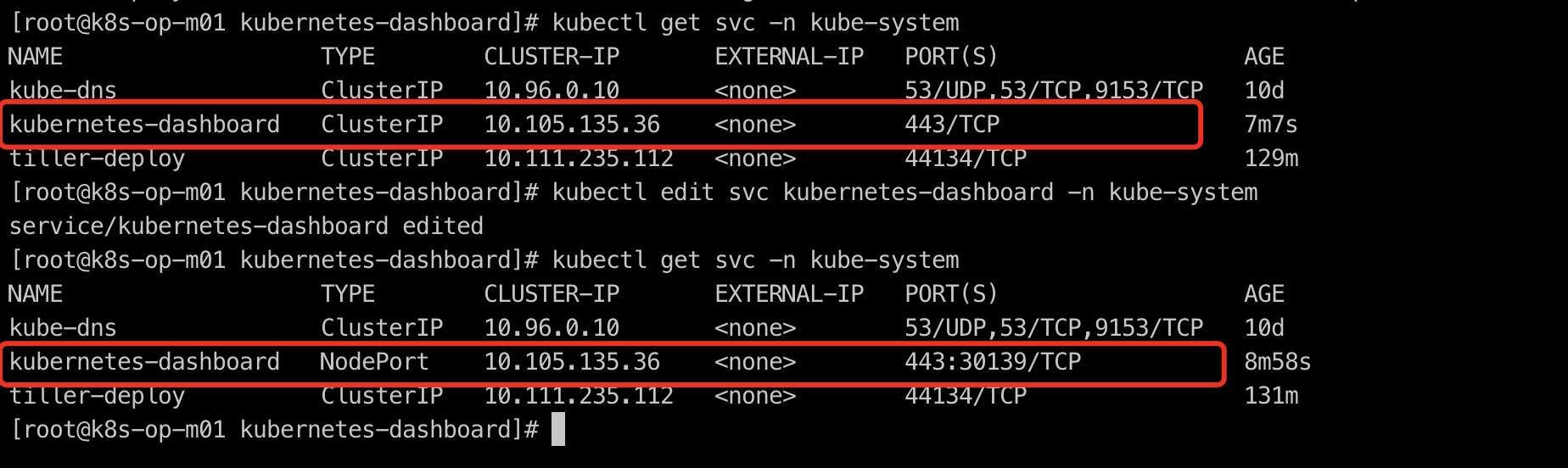 kubectl edit svc kubernetes-dashboard -n kube-system