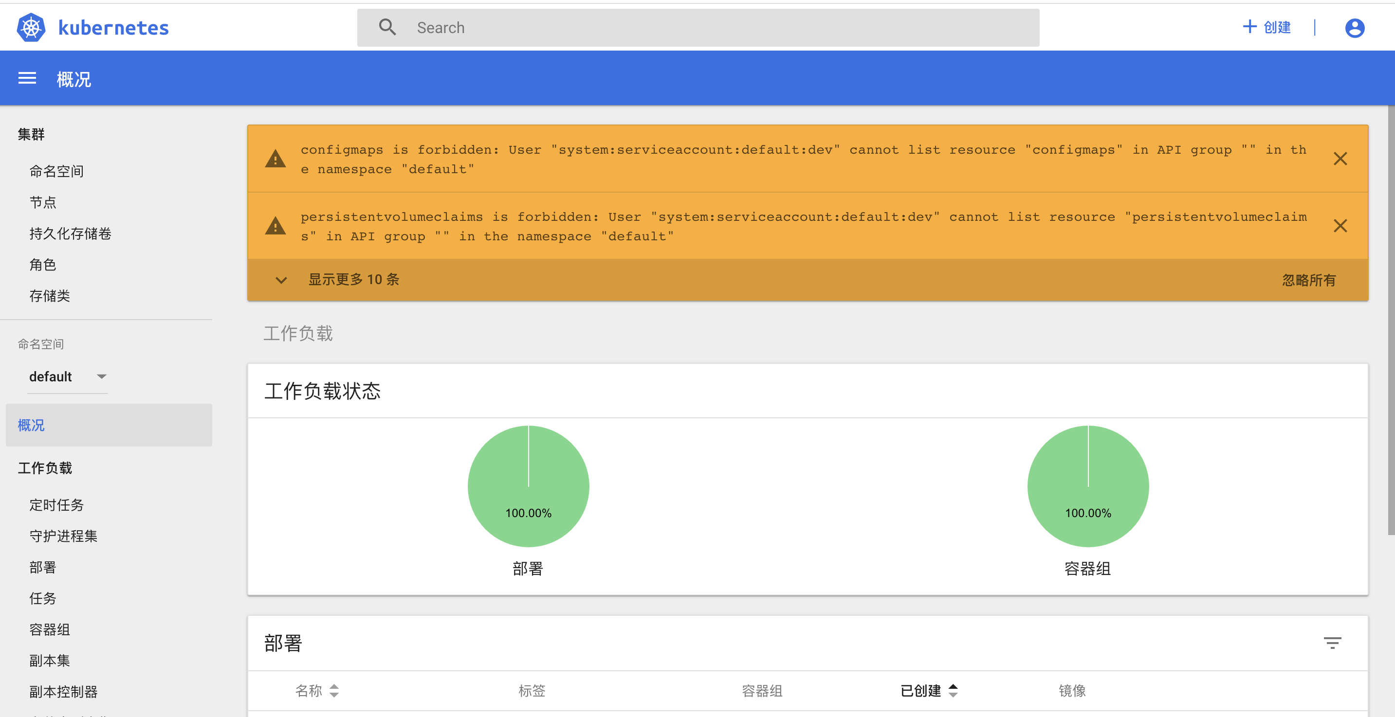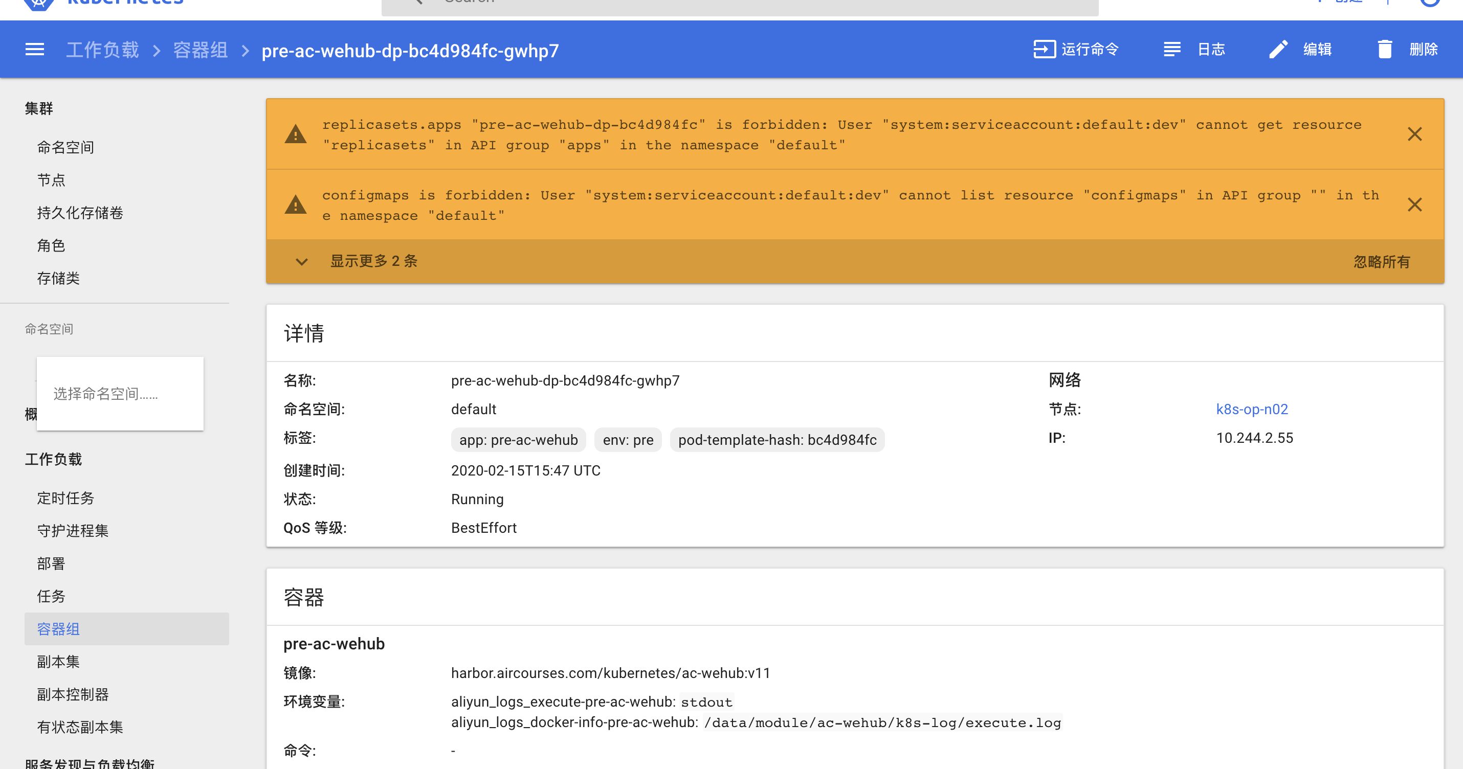 普通用户登陆的时候只能显示 自己的namespace 不是开通的所有权限 所以会有警告