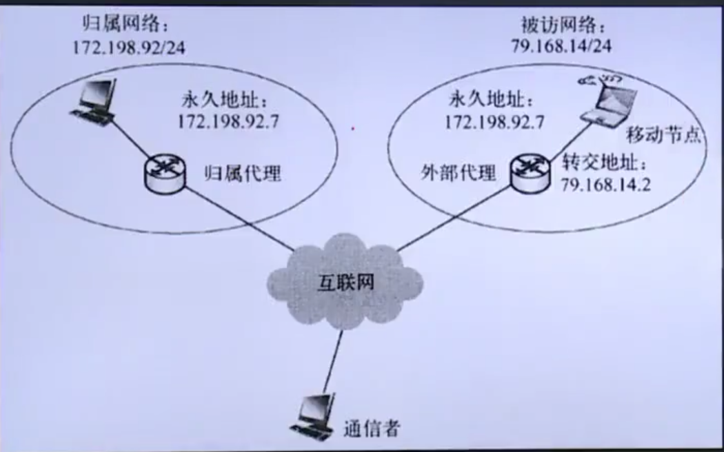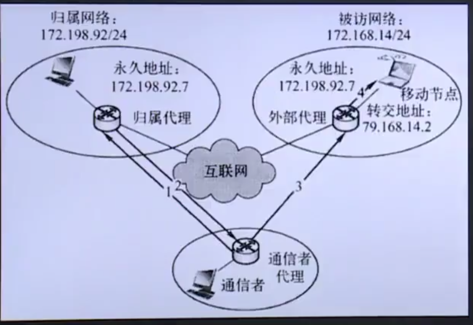 因为通信者始终是和永久地址进行通信的,这个移动节点改变了之后,通信者并不知道,通信者依然会把数据发送给归属网络,路由器里的路由表记录的就是归属网络,所以在归属网络中,需要一个归属代理,把接生的数据转发给新的网络中的路由器,这个路由器叫做外部代理,按照新的地址交给移动节点,想你的时候就直接发送给通信者。