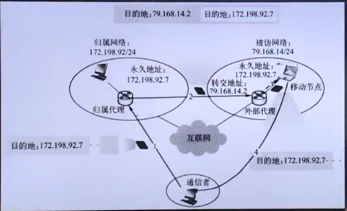 相信我们每个人都用过网络,我们到他某个地方,所在的网络会给我们分配一个 Ip 地址,这个地址就是永久地址,如果通信者要和这个移动端通信的话,就是和这个永久地址建立通信,但是这个节点有可能发生移动,进入到另一个网络,进入到另一个网站之后,会给重新分配一个地址,使用新分配的那个 Ip 地址进行通信,这个网络就称为被访网络,获得的这个地址,我们称为转交地址。
