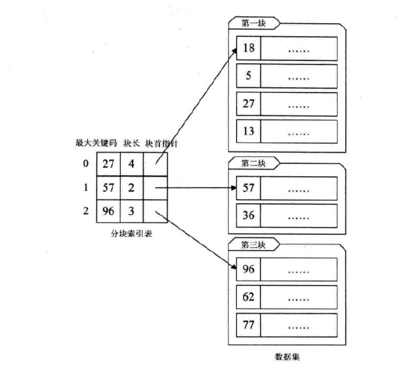 - 块间有序, 例如,要求第二块所有记录的关键字均要大于第一块中所有记录的关键字,第三块的所有记录的关键字均要大于第二块的所有记录关键字......因为只有块间有序,才有可能在查找时带来效率。