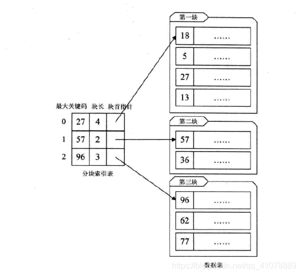 - 在分块索引表中查找要查关键字所在的块。由于分块索引表是块间有序的,因此很容易利用折半、插值等算法得到结果。例如,在图的数据集中查找62,我们可以很快可以从左上角的索引表中由57<62<96得到62在第三个块中。