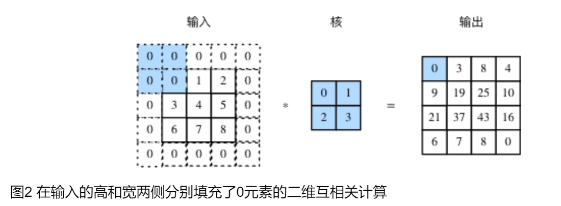填充(padding)是指在输入高和宽的两侧填充元素(通常是0元素),图2里我们在原输入高和宽的两侧分别添加了值为0的元素。