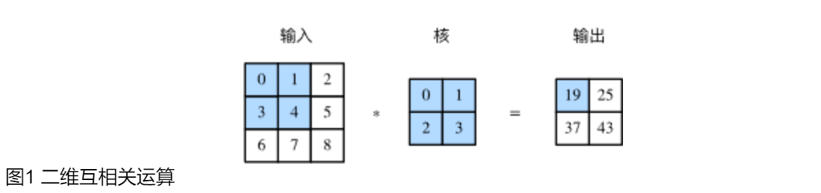 二维互相关(cross-correlation)运算的输入是一个二维输入数组和一个二维核(kernel)数组,输出也是一个二维数组,其中核数组通常称为卷积核或过滤器(filter)。卷积核的尺寸通常小于输入数组,卷积核在输入数组上滑动,在每个位置上,卷积核与该位置处的输入子数组按元素相乘并求和,得到输出数组中相应位置的元素。图1展示了一个互相关运算的例子,阴影部分分别是输入的第一个计算区域、核数组以及对应的输出。