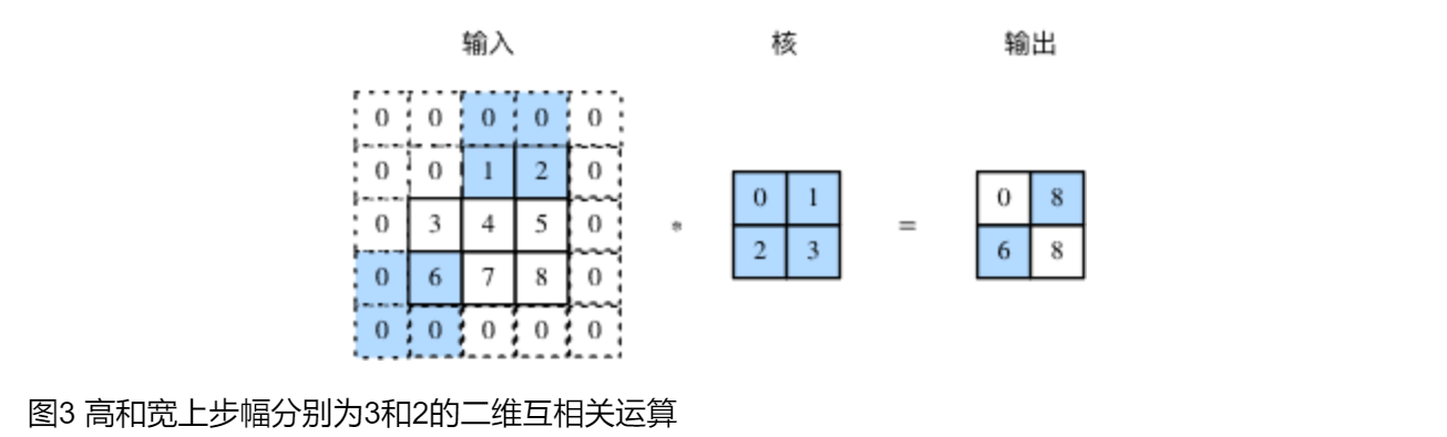 在互相关运算中,卷积核在输入数组上滑动,每次滑动的行数与列数即是步幅(stride)。此前我们使用的步幅都是1,图3展示了在高上步幅为3、在宽上步幅为2的二维互相关运算。