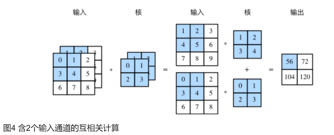 卷积层的输入可以包含多个通道,图4展示了一个含2个输入通道的二维互相关计算的例子。