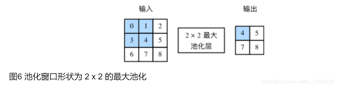 池化层主要用于缓解卷积层对位置的过度敏感性。同卷积层一样,池化层每次对输入数据的一个固定形状窗口(又称池化窗口)中的元素计算输出,池化层直接计算池化窗口内元素的最大值或者平均值,该运算也分别叫做最大池化或平均池化。图6展示了池化窗口形状为2×22×2的最大池化(还有平均池化层)。