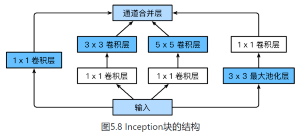 - Inception块相当于⼀个有4条线路的⼦⽹络。它通过不同窗口形状的卷积层和最⼤池化层来并⾏抽取信息,并使⽤1×1卷积层减少通道数从而降低模型复杂度。