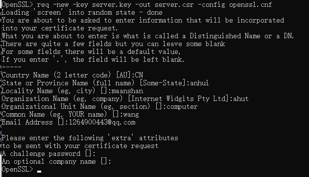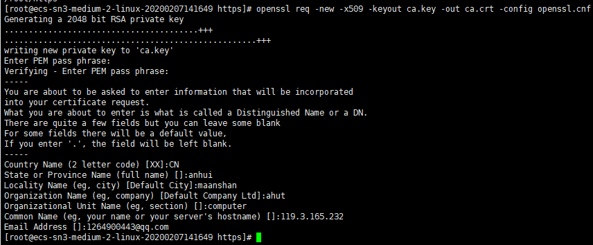 需要依次输入国家,地区,组织,email。最重要的是有一个common name,可以写你的名字或者域名。如果为了https申请,这个必须和域名吻合没有域名输入公网IP,否则会引发浏览器警报。生成的csr文件交给CA签名后形成服务端自己的证书。