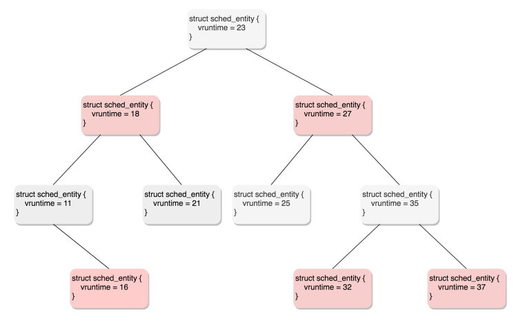 看来CFS需要一个数据结构来对vruntime进行排序,找出最小的那个。这个能够排序的数据结构不但需要查询的时候,能够快速找到最小的,更新的时候也需要能够快速的调整排序,要知道vruntime可是经常在变的,变了再插入这个数据结构,就需要重新排序。能够平衡查询和更新速度的是树,在这里使用的是红黑树。