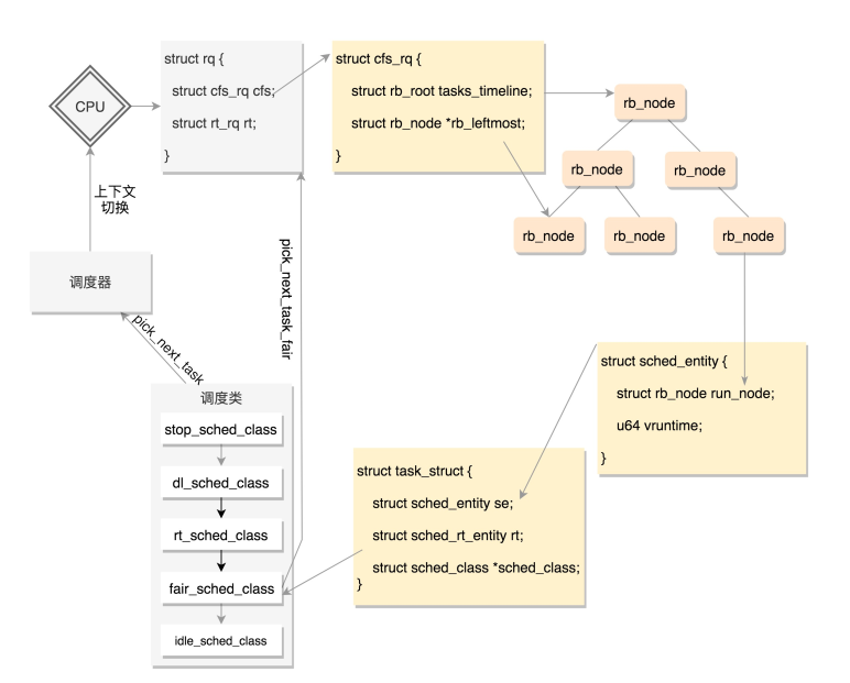 每个CPU上都有一个队列rq,这个队列里面包含多个子队列,例如rt_rq和cfs_rq,不同的队列有不同的实现方式,cfs_rq就是用红黑树实现的。