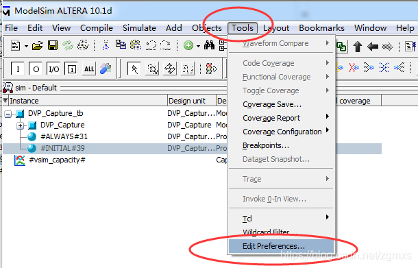 在modelsim主界面菜单中依次点击【Tools】->【EditPreferences】菜单打开配置窗口,注意,是在modelsim主界面,不是在modelsim的wave窗口。如下图所示: