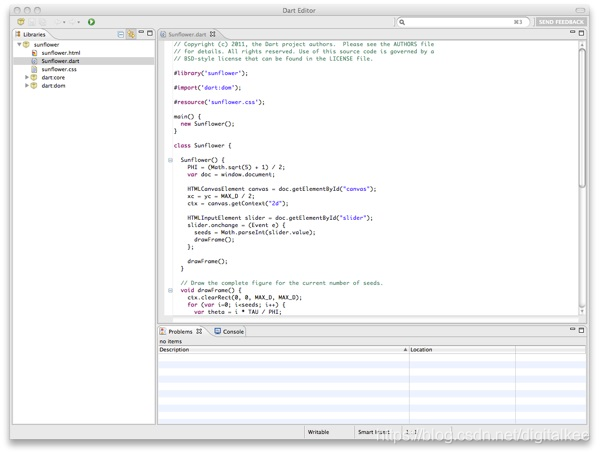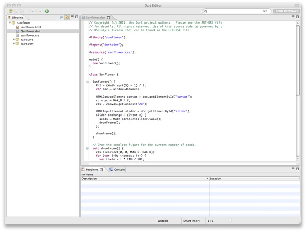 Dart Editor是Google开发设计的,旨在帮助开发者制作光亮而惊叹的Web应用。Dart Editor支持多种开发语言,同时也集成了Dartium。通过它的静态分析引擎,你可以创建,维护,调试和开发自己的Web应用。函数、类、方法等都能以树的结构列出来,方便你编写代码。
