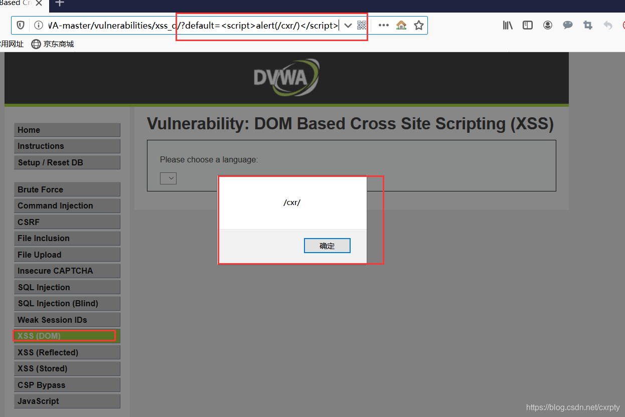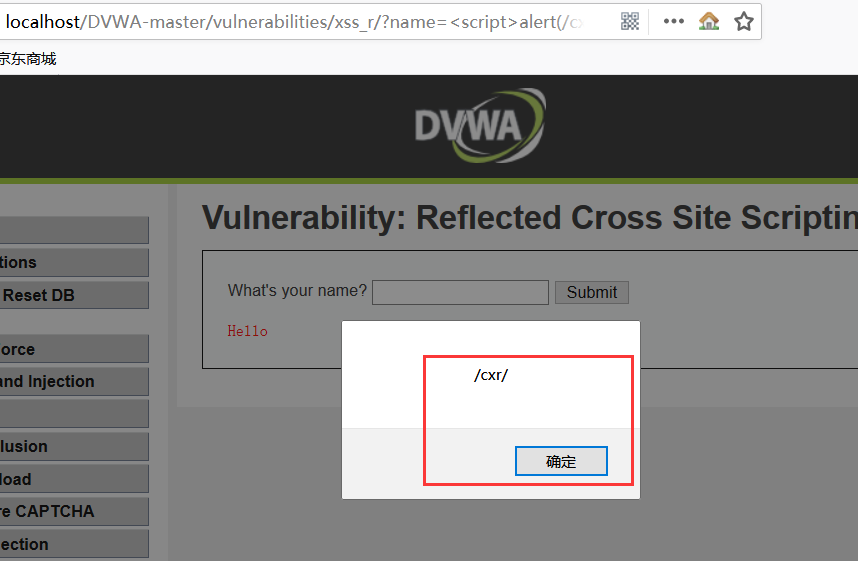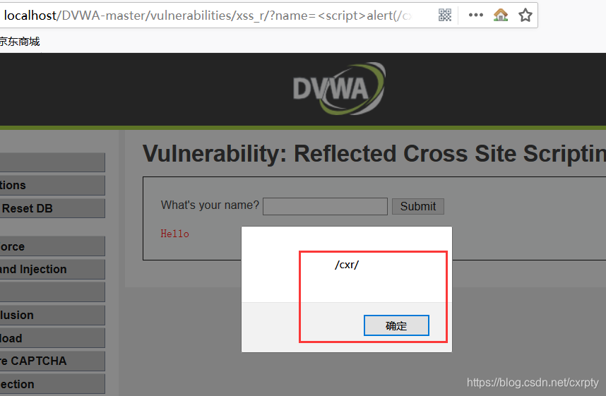 2.修改参数的值为:<script>alert(/cxr/)</script>,弹出下面窗口,再次点击无法出现该窗口