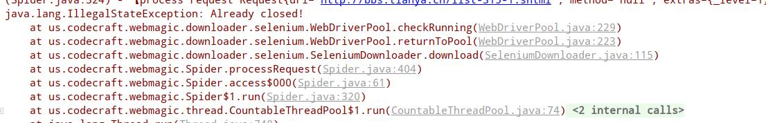后来发现是SeleniumDownloader 实在循环外启动的,导致webDriverPool的stat还是2,不能重新执行。