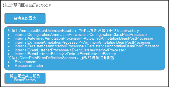 - Spring 启动时,首先会将主配置类和基础的后置处理器类注册到 BeanFactory