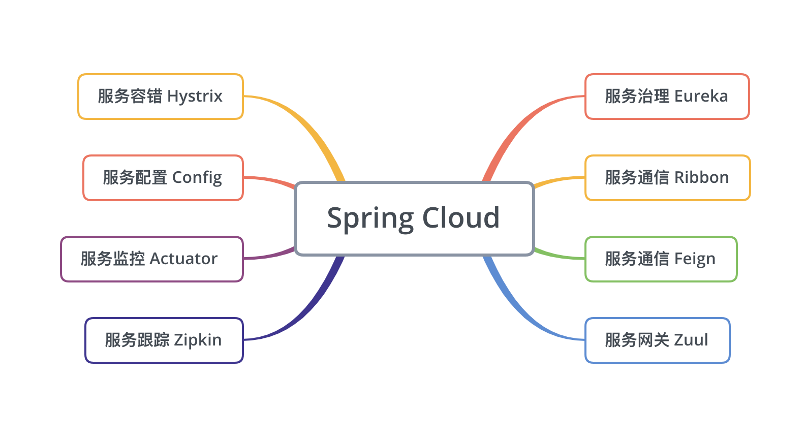 Spring Cloud 基于 Spring Boot 使得整体的开发、配置、部署都非常方便,可快速搭建基于微服务的分布式应用,实现了分布式系统中的公共组件,如服务注册、服务发现、配置管理、熔断器、控制总线等,服务调用方式是基于 REST API,整合了各种成熟的产品和架构。核心组件如下图所示: