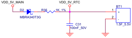 芯片内部自带RTC时钟控制器,通过RTC座引出接口,电压值为5V,其接口为BT1。引脚定义如下图: