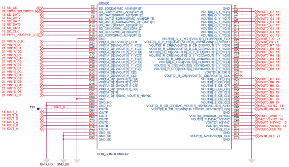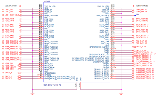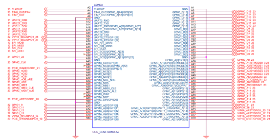 开发板使用底板+核心板设计模式,通过5个80pin、0.5mm间距、合高4.0mm的B2B连接器对接,其中底板CON0D和CON0C为母座,CON0A和CON0B为公座,CON0E是高速B2B连接器,以下为底板各个B2B的引脚定义: